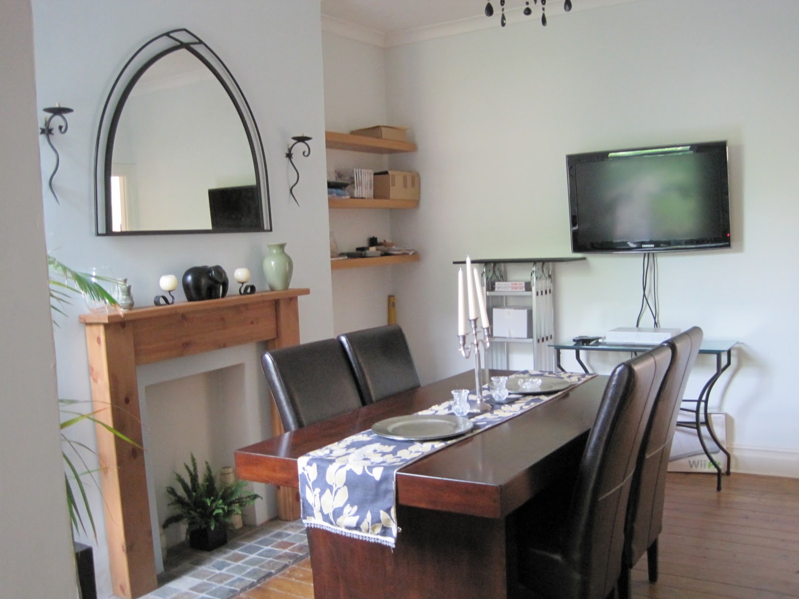 But what you haven’t seen is how bad the wall to the right of the fireplace actually looked.Β I’ve spoken before of our reasoning for having a large LCD television in the dining room and my plans for creating a gallery wall.Β However, prior to bringing home the sideboard, we had the most inappropriate glass console table we were using to house the stereo, the remote controls, two games consoles and countless other paraphenalia including an absolute MESS of leads.