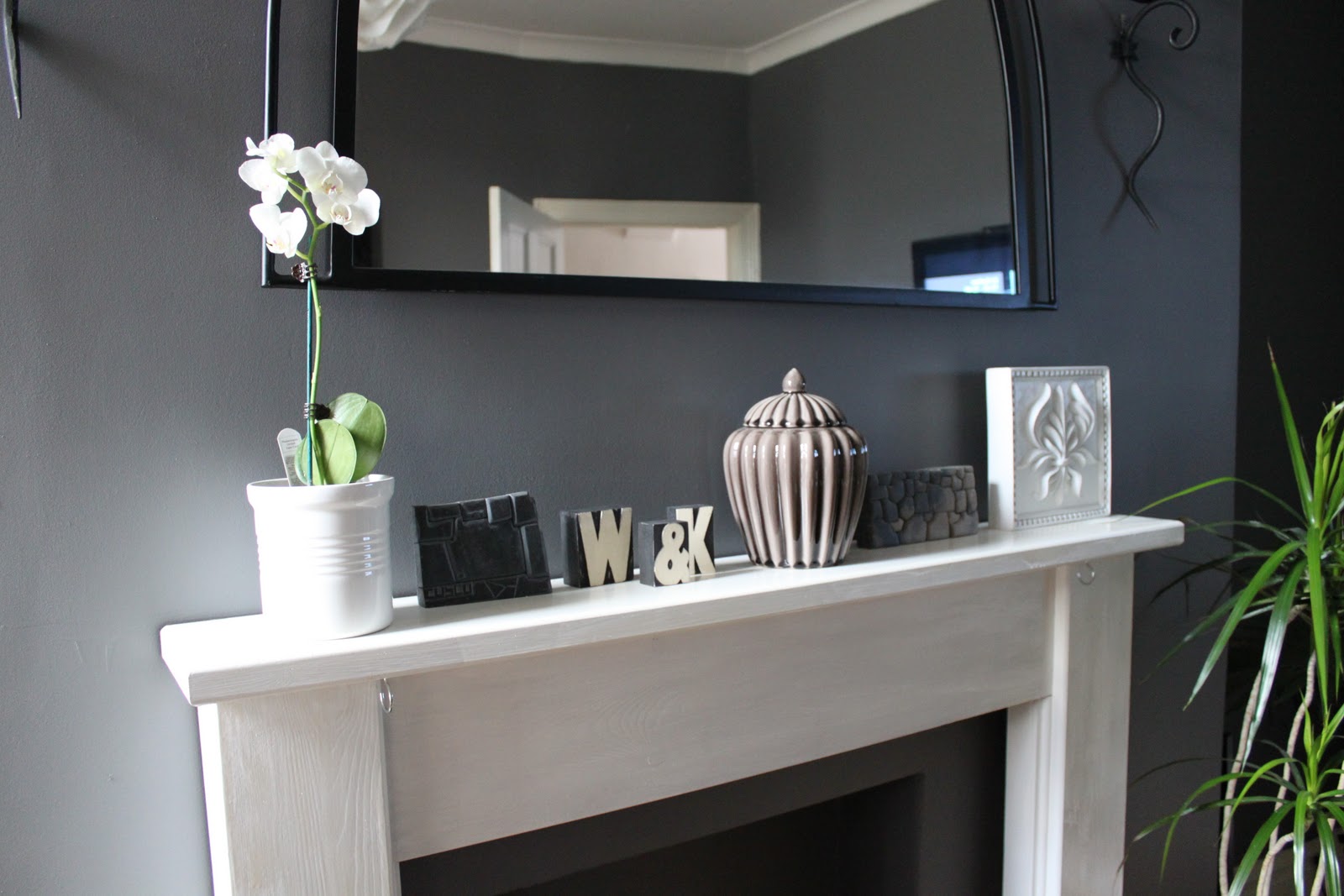 We decided to go with a deep dark grey on the walls and I painted the mantle white.Β I then proceeded to arrange and rearrange said mantle ad naseum…