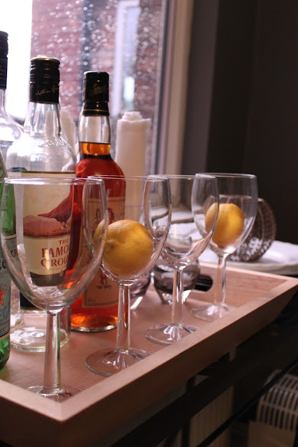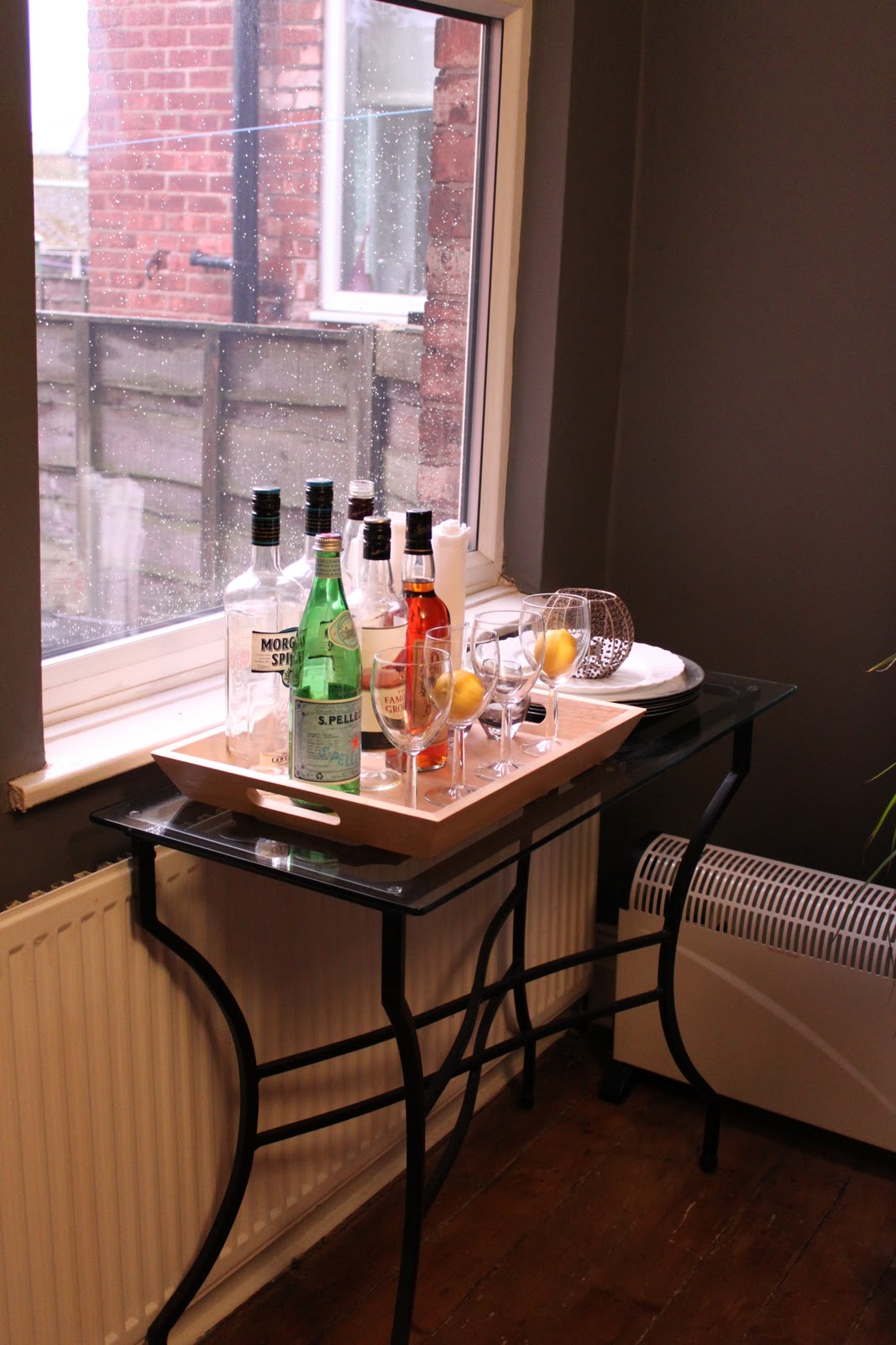 So what about the little glass console table?Β Well it’s been repurposed at the moment as a sort of drinks station until I get my proper one.Β What do you think?Β (I know the bottles are mostly empty, what can I say, we like a drink…)