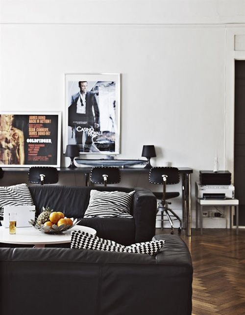 Black and white are always sexy, though, and work in both masculine and feminine interiors.Β The introduction of velvet and a bit of snow leopard just adds to the sexy factor.Β Yum yum.Β Strong geometrics, straight lines and framed architectural prints make this room a swoon-inducing favourite.