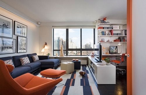 Introducing bright colours like orange mixed with navy and white keeps the space bright without venturing anywhere near ‘girly’.Β Β A football, a dragon and a flat screen all ensure this space is a testosterone-friendly zone.