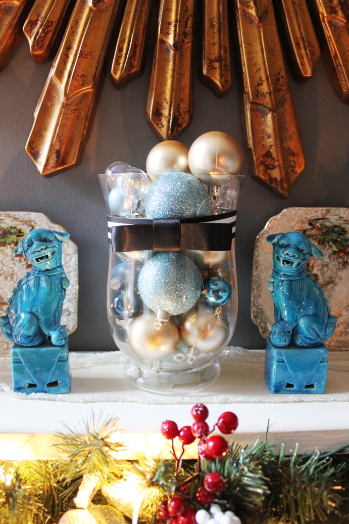 As my loose ‘theme’ this year is white, gold and turquoise (with a bit of leopard print and black and white on my tree thrown in), I decided to keep my foo dogs on the shelf.Β  Just about everything else had a bit of a swap-a-roo.