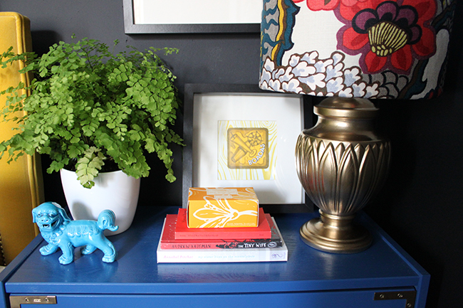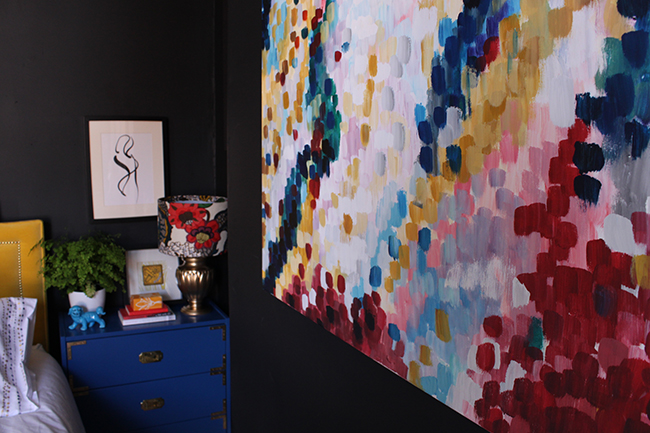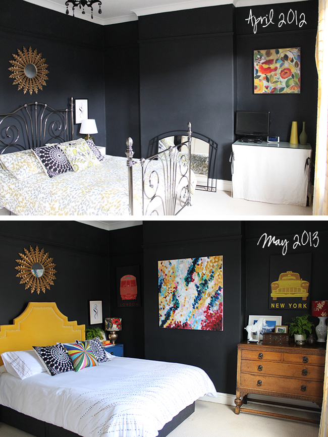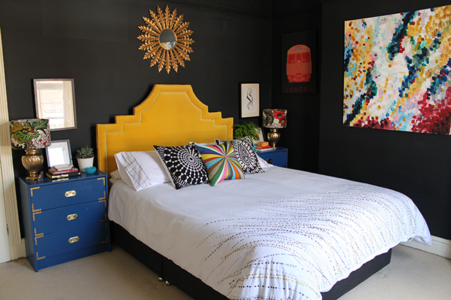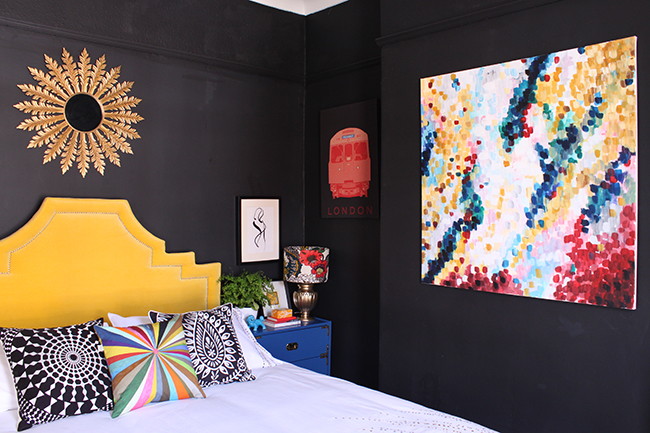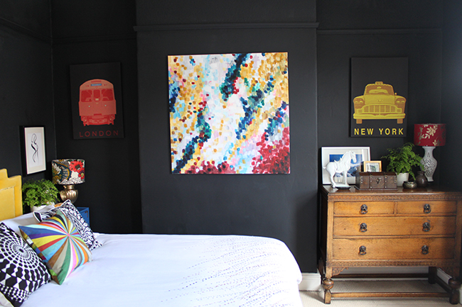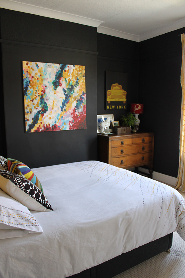 The whole room looks so much more cohesive as well.Β  The artwork really pulls all the colours together (which is what I wanted from it) and the room looks bright and fresh even with the charcoal black walls.