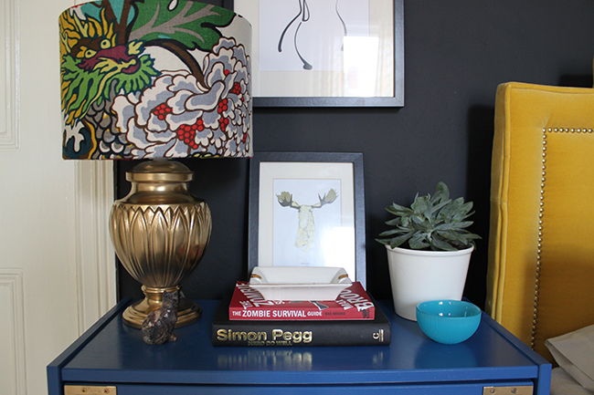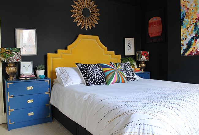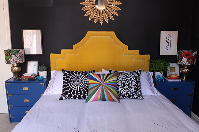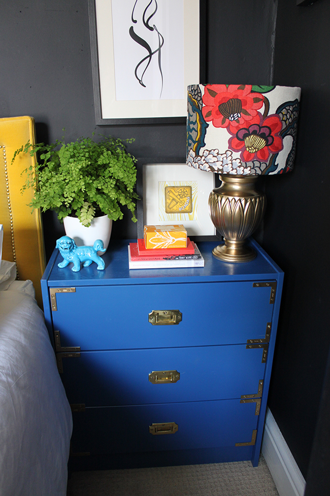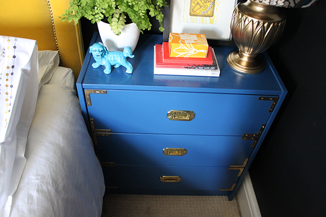 Now, I know having bright blue dressers with a yellow headboard won’t be to everyone’s tastes.Β  Serene, soft bedrooms seem to be the order of the day, everyone wanting a simple calming palette but ya know, I’m not one to go with the majority on anything that I do in my home and I’m the one who lives with it in the end so I threw caution to the wind and ordered a few cans of Montana White Monaco Blue glossy spray paint.Β  I never spray-painted furniture before believe it or not but with a coat of Rustoleum spray primer in Grey, a couple of coats of this, the whole project was done over a single weekend.