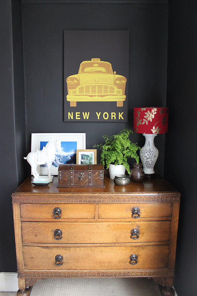 The only thing I’d like to do really is replace the ‘London’ ‘New York’ canvases with something else.Β  I’m thinking a small collection of prints or an oil painting or a big mirror somewhere in there.Β  I haven’t decided nor found anything I’m in love with yet and the colours work perfectly so I’m leaving them as is for now until I come across something that will work for the space.