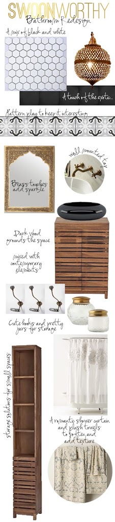 You have surprised me! Fully expected you to go colourful but love this fabulously chic white, black and gold design. :) About that pendant… it's gorgeous but does your bathroom get steamy? You'll have to go with bathroom lighting then, as they are sealed for damp environments. <br />Glad you're on the mend, lovely! (What had happened?) <br />xxx