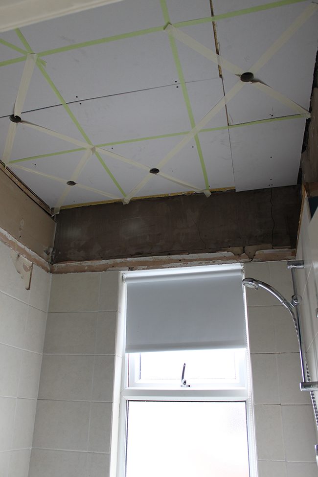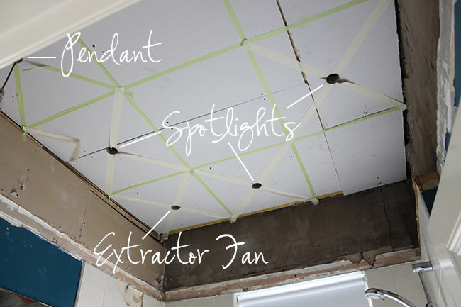 So what did we actually do?  Well, on Saturday, Wayne put up the drywall on the ceiling and cut the holes for the pendant, 3 spot lights, the extractor fan and the pull switch.  The pull switch will allow you to shut off the spotlights so that just the lovely refracted light of the Moroccan pendant will be on if you wanted a bit of mood lighting for a lovely long soak.