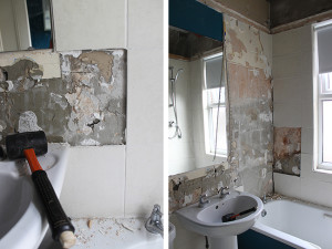 The wall behind the tiles, as expected, is a bit of a mess and will take some work to make it nice and even ready for tiling.  Removing small tiles is a lot easier but the existing ceramic tiles are pretty big and I managed to cut my leg from flying shrapnel.  Not for the faint hearted!  And don’t be stupid and wear cropped jeans when carrying out this kind of work.  Learn from my mistakes ;)