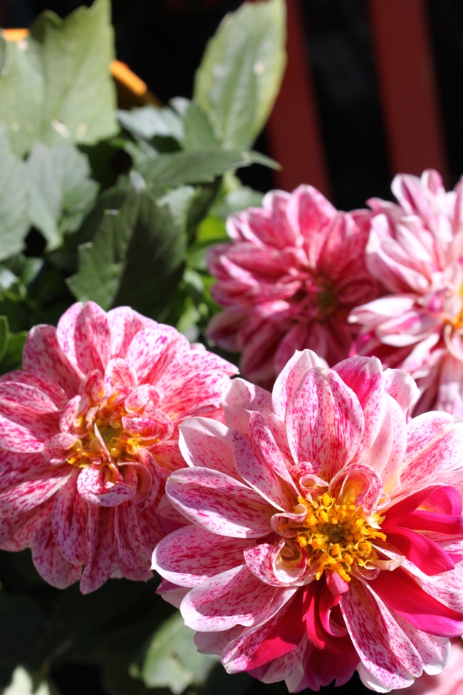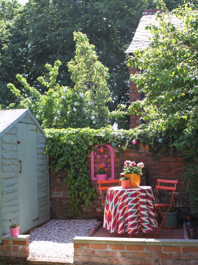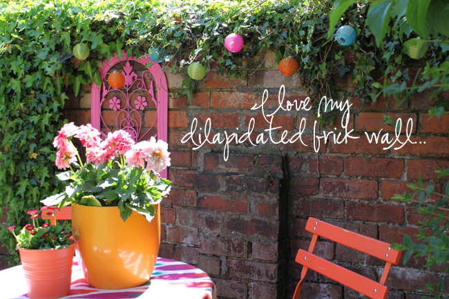 What, you mean that kitty under the table?! ;-) Love your garden! It's sweet and colourful and the brick wall is great – don't ever change it! :-)