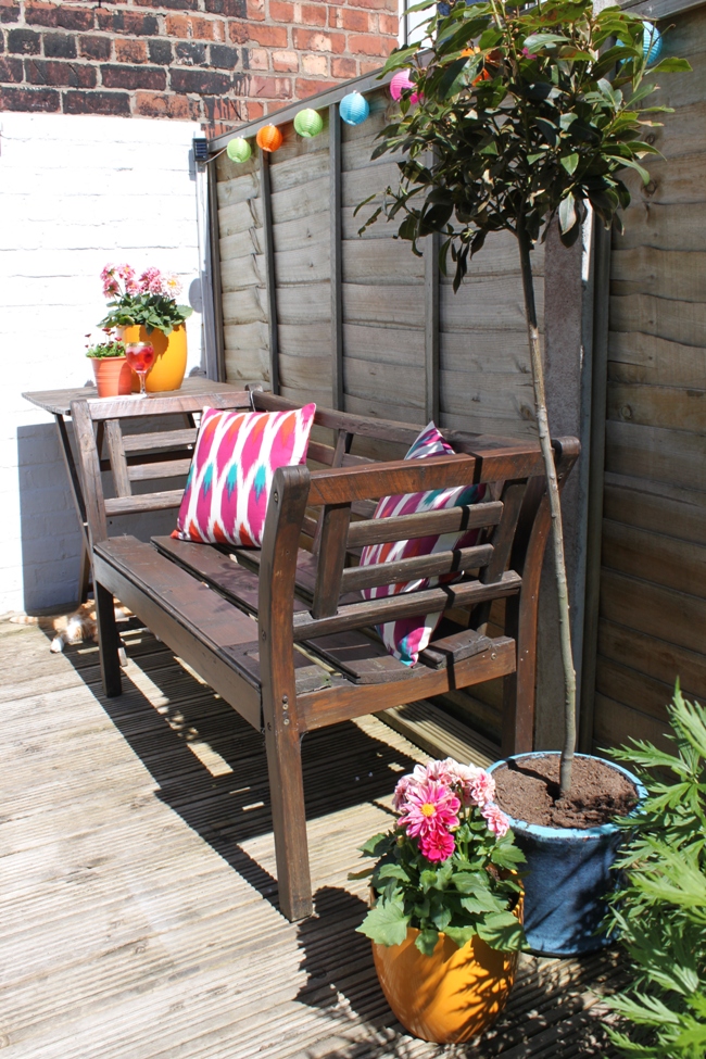This deck has been looked at in disgust for quite a long time but adding some more pots of flowers, the bay tree that I’m trying to nurse back to health and the cushions has improved it a bit, even if we probably won’t get around to extending it this year and getting new furniture (on the list for 2014!).