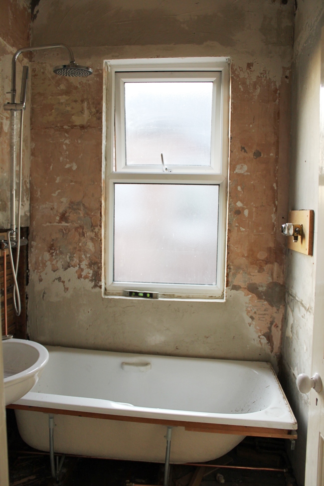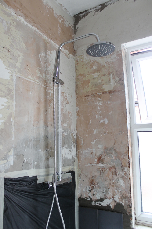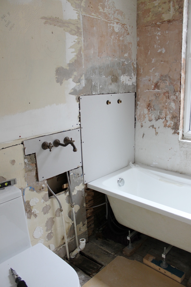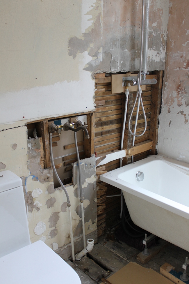 Thursday, he was back at it and made some decent progress but it meant working from 8am until 10pm to see if he could catch up on all the time that’d been missed.Β It was mostly plumbing work that was carried out this day and realising that the bathtub wall tap we got from Victoria Plumb was a piece of shit and couldn’t be used as there was no way we could get fittings for it despite spending a ridiculous amount of money and endless trips to B&Q trying desperately to make it work.Β Β It was the only thing I purchased from them and it’s really turned me off to using anything else by Victoria Plumb.Β Just a warning, there.Β We’ve had to order another one but I’ll get to that later…