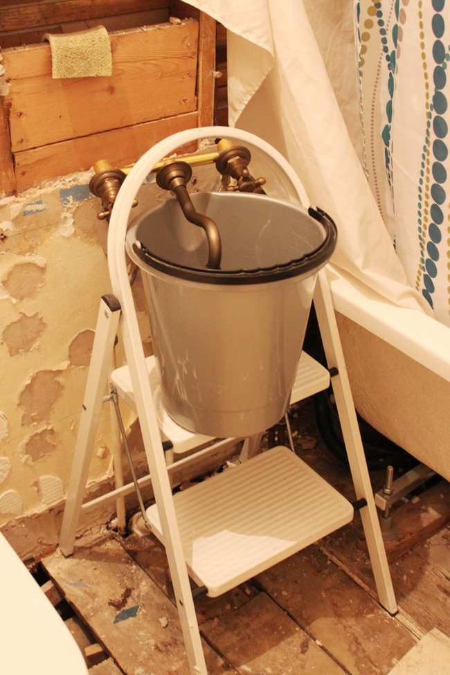 On Wednesday, he started to feel ill.Β We don’t know if it’s because of the heat or because he had been working with the sewer pipes (errghh) or a combination of both but he lost nearly a day for feeling completely like crap.Β Despite this, he did manage to swap out the toilet and bathtub and getting the skip we’d ordered filled up with the old suite and all the rubble so he had some more room to work.