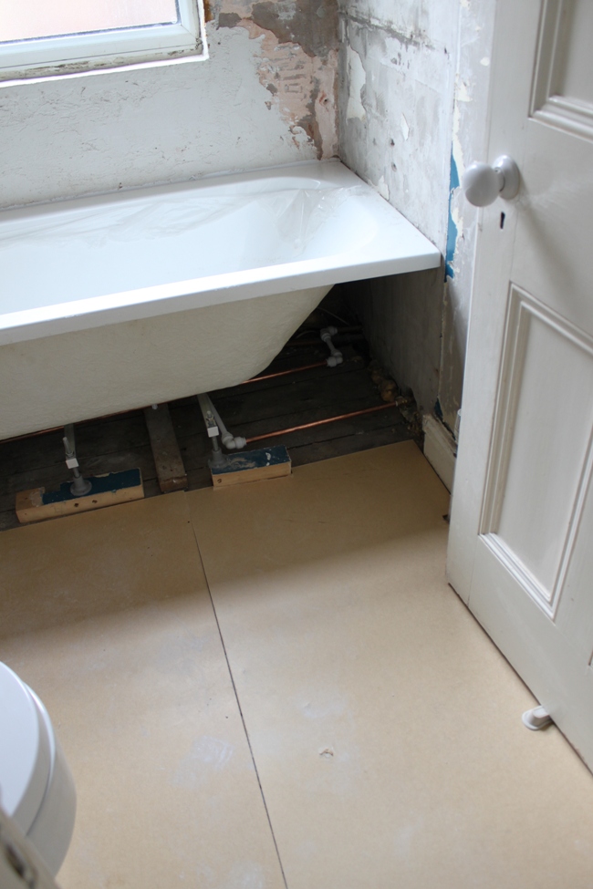 This weekend, the work started again, this time with me being able to help a bit more.Β The plumbing work was finally completed (except for the bathtub wall tap) and finally NOTHING WAS LEAKING.Β I got a coat of paint on the ceiling, we got plasterboard up around where the walls were removed and the sink tap was secured in place.Β We also got some hardboard down on the floors ready for the flooring to go down.