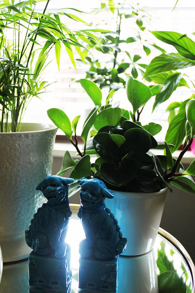 I also added a few more plants (yes, yes, it’s an addiction, I admit) but I’m loving how this window is filling out. My foo dogs are now hanging out in the living room too after taking their leave from my dining room mantle.
