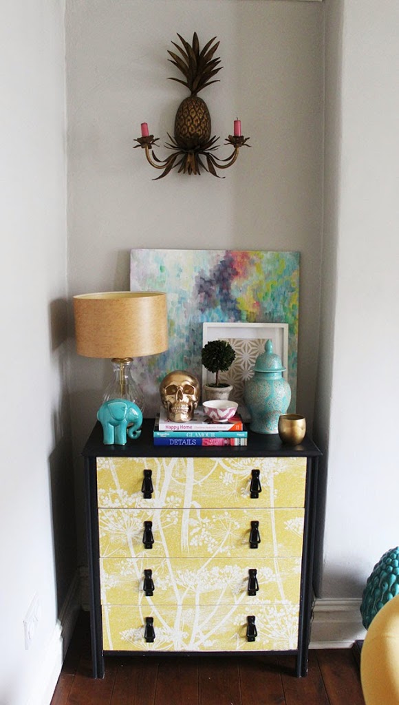 As it’s already in my head that I want to change the far wall (across from the bay window) so in preparation for whatever I decide (I’m not 100% sure of my decision yet but I have a couple ideas), I decided to incorporate my own art as well as one of the pieces that were on that wall to the little wallpapered chest of drawers.