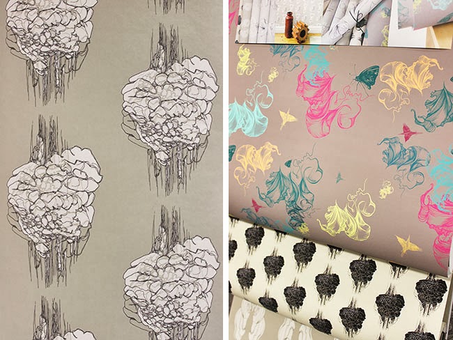 Moving back illustration and design, also exhibiting was surface pattern designer Claire Murray who’s wallpapers had so much movement, it almost looked as though her hand drawn prints were created floating underwater.  I loved the neon printed wallpapers and how depth was created using birds and butterflies throughout.
