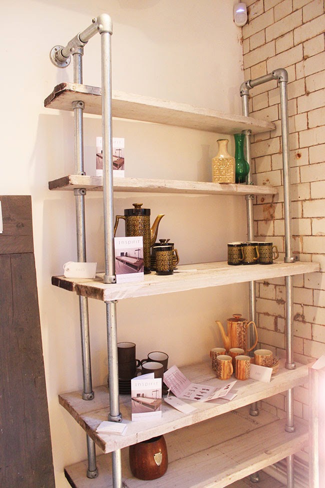 Wayne, who I dragged along with me on the promise of an early dinner and a few drinks afterwards, bless him, was very impressed with the structures of bespoke furniture designers Inspirit.  The wood and pipe shelving was something we’d considered doing long ago and seeing them in person reignited Wayne’s interest in creating something similar in the Man Cave.