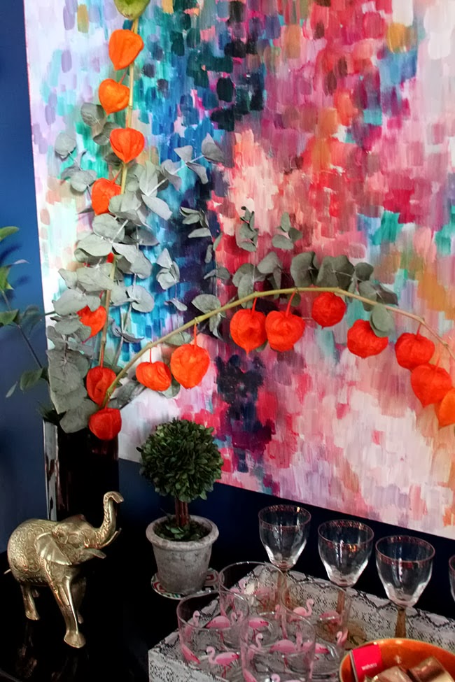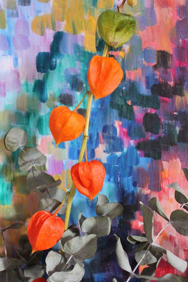 Oh yes, I picked up those little cool branches at my local florists. They are called Chinese Lanterns mixed with a few branches of eucalyptus. They look a bit like little pumpkins, no? Yeah, that’s as far as my Halloween decorating goes I’m afraid.