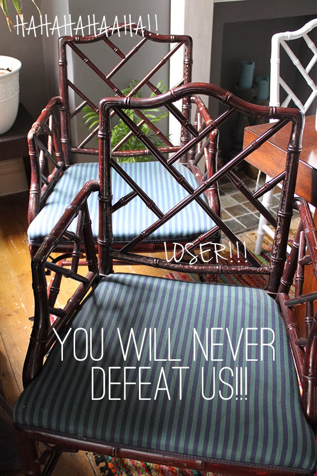 When I got my latest set of Faux Bamboo chairs, I said PUBLICLY ON MY BLOG that I was going to be embarking on my very first upholstery project.