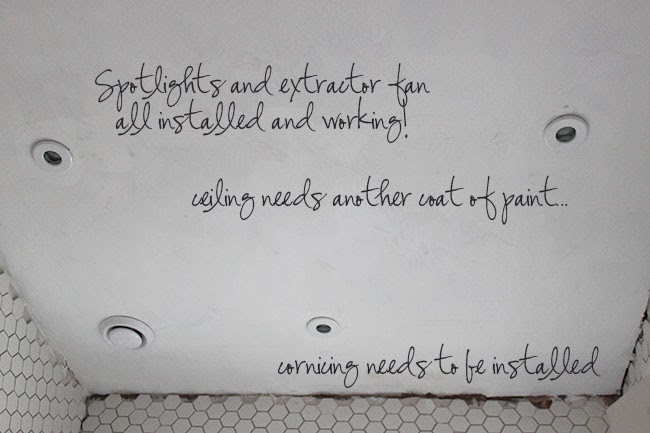 We’ve also installed the spotlights and the extractor fan is working now but the ceiling still needs a second coat of paint. And obviously, that cornicing installed. The cornicing can’t be installed, however, until all those little tiny tiles are in place and we can grout the upper half of the walls.