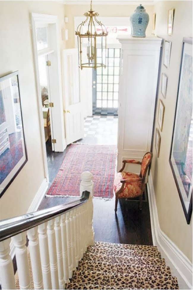 Hallway and Stairs:  Another area we need to finish the flooring, give the stairs a makeover, possibly add wallpaper and/or paint, get some new lighting and accessories. I don’t have room for any grand furniture but I love the playful mix of patterns in this bright, welcoming entrance space.