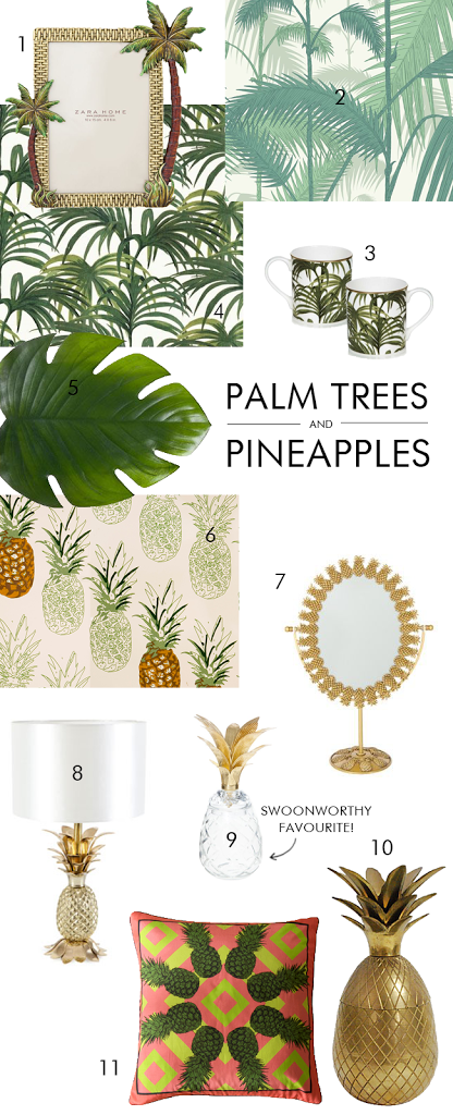 I purchased the little glass pineapple (#9) with the gold top recently and it’s proudly sat in my living room which I’ll hopefully be showing you soon.  The Cole & Son wallpaper (#2) has been a favourite for quite some time – I have no idea where I’d use it, mind you, but I love it all the same.  Perhaps I need to just deck out a chair in that amazing House of Hackney Palmeral fabric (#4) to satisfy my tropical cravings.