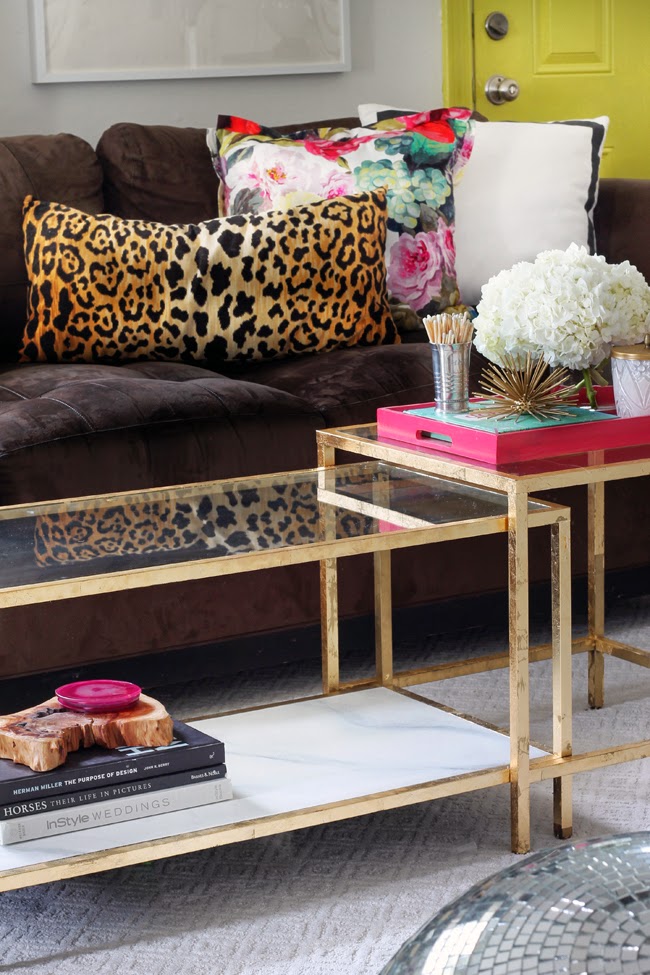 I am so obsessed with this! It's all my favorite colors (teal, mustard, brass/gold) and prints (hello leopard! black & white abstract) and objects (chesterfield, fiddle leaf fig, brass light fixtures) in one place! I would so move right in!