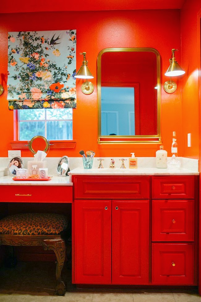 This bathroom definitely caught my eye – in pillar box red, how could it not? I would never have even considered painting a bathroom in red lacquer like Bailey Quinn did here in her client’s abode – I mean, I’m brave but I’m certainly not that brave – but there’s something about this that appeals to me. The powder blue shade, the brassy touches, the leopard print bench? It shouldn’t work, it really shouldn’t – but somehow it does.