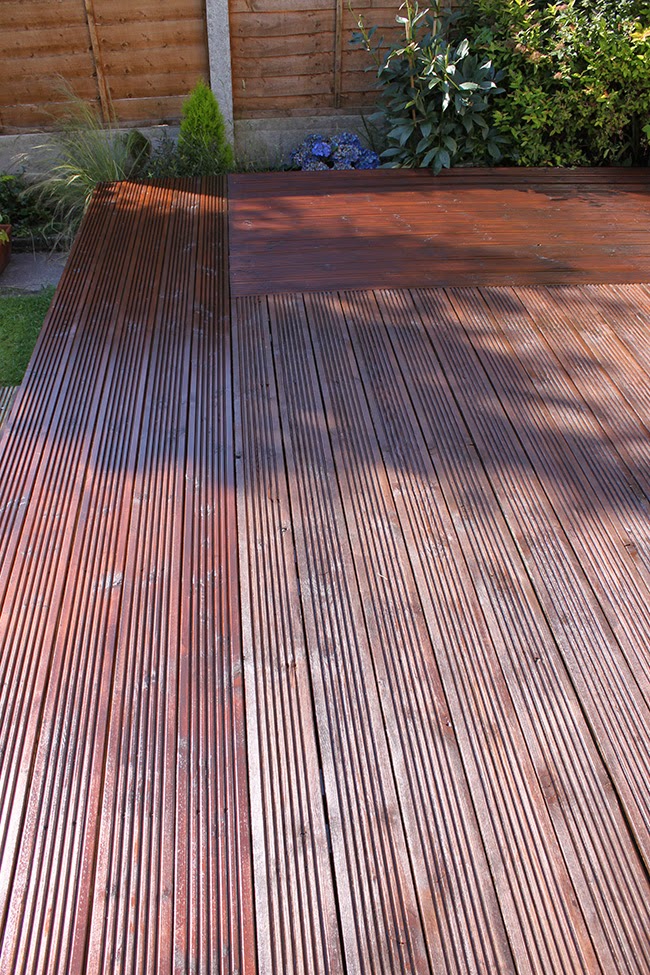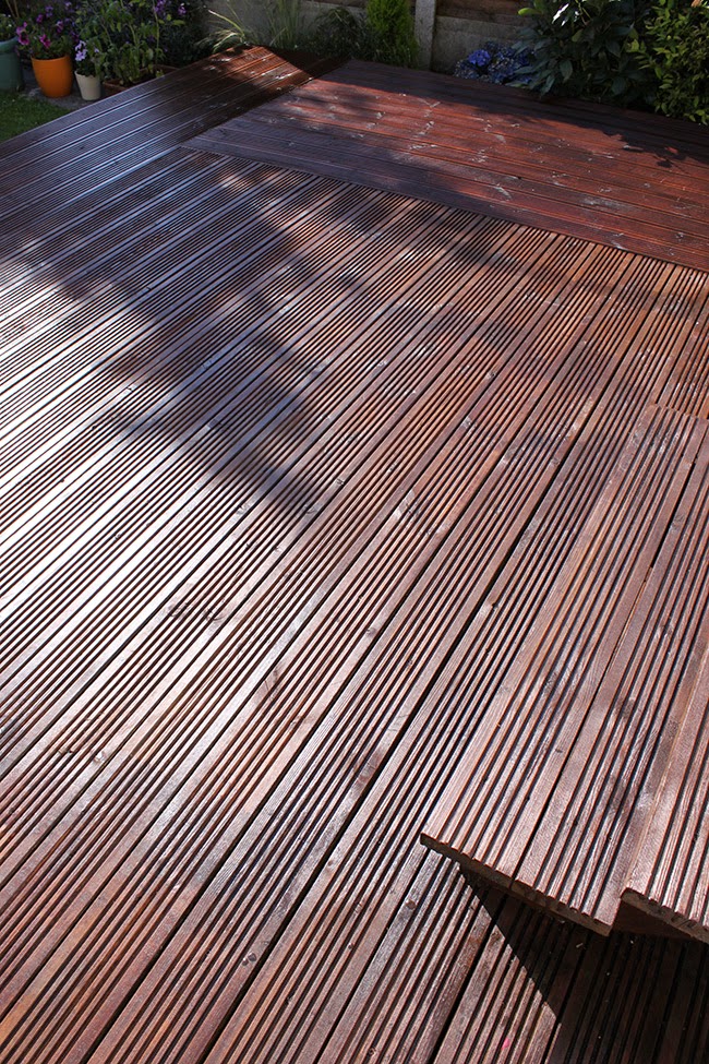 Oh man, this nicely marries the new and old decking together. I'm still going to go on a bit about the way you added onto the deck, if you don't mind; it really makes a feature of the space and adds a quirky little element and almost a mini subtle focal point to the deck. <br /><br />I also really like the stain that dark. Yep. Well played. Will the fence that you install be the same