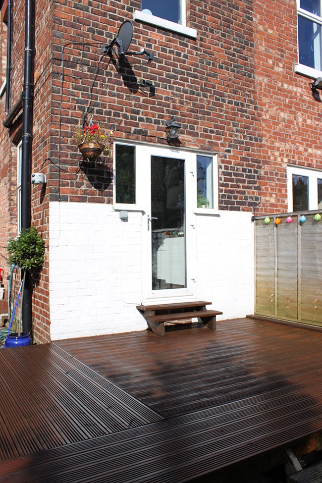 Good question and no, I hadn't answered it before :) A few reasons really – we store our bins at that side and so we'd have no where else to put them (I didn't really want to incorporate 4 large bins in the design – ha!); the basement window (the only natural light the 'man cave' receives) would have been blocked by the decking; the old stairs from where the back door used to