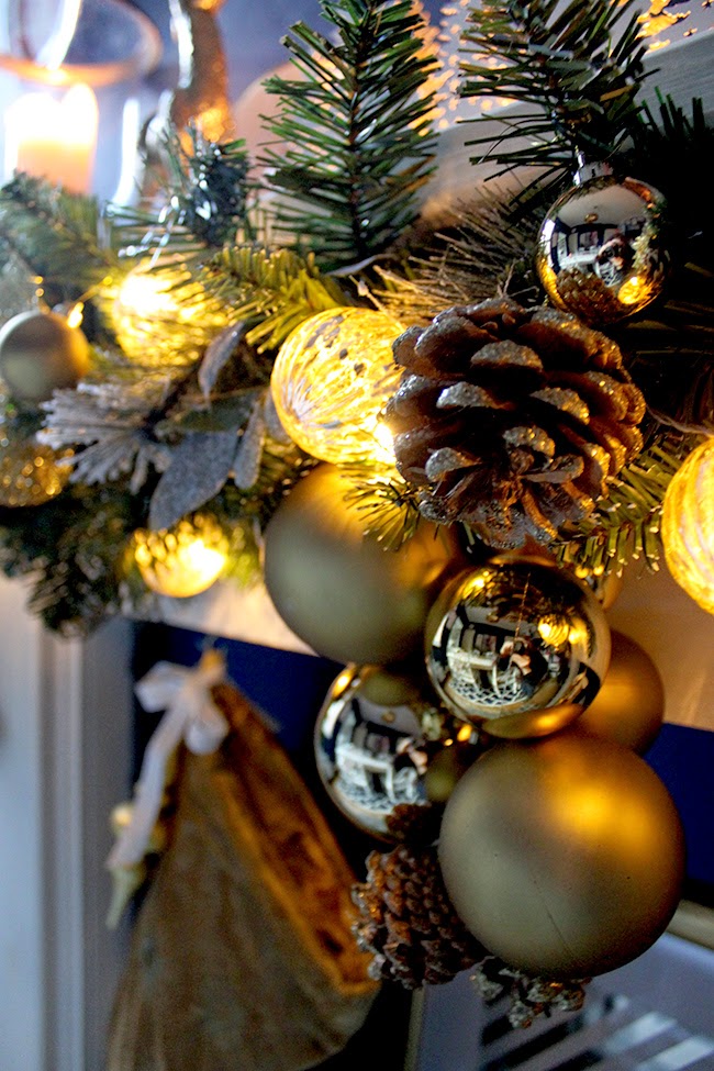 I wish I had a mantle to decorate!!! Ok, I do at the place where I'll spend Christmas, but it's not the same as having one at home… Anyway, this is gorgeous in a classic Kimberly way! :-) I love it, it's festive, just a little OTT and very glam. It also contrasts rather nicely with the dark blue wall. <br /><br />I don't tend to buy many decorations now, I have some very simple
