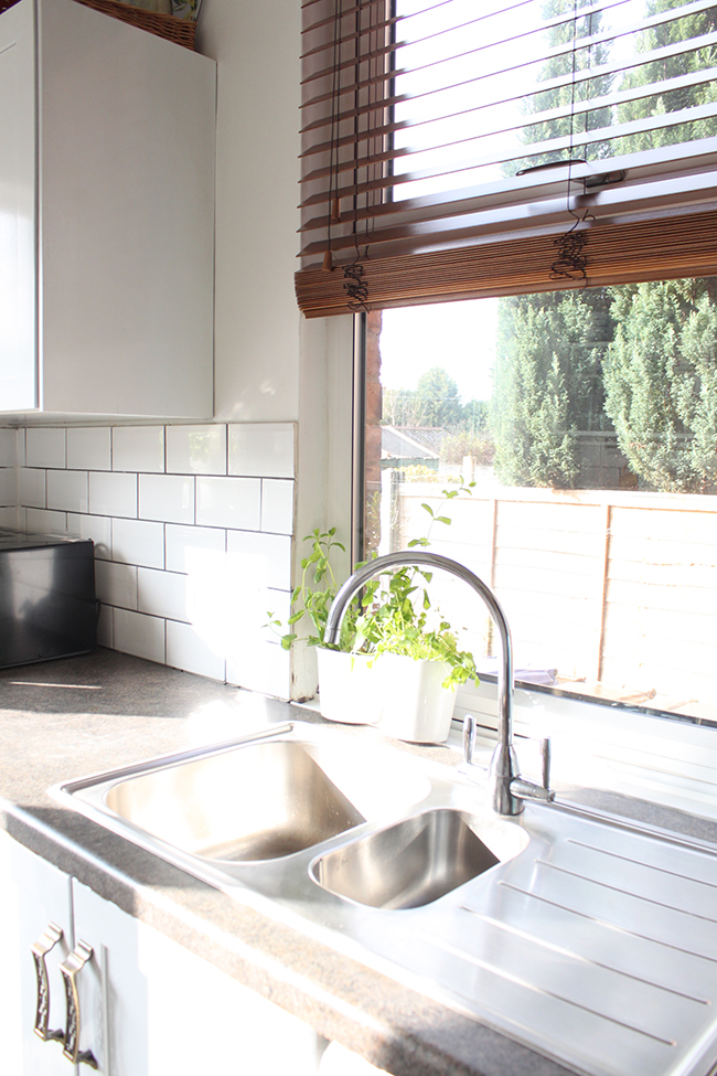 Now, the turquoise blind had always meant to be temporary (I think we paid Β£16 for it!) so I thought I would continue that dark wood theme in a set of custom wood blinds as well. We have them in our living room and in the dining room so it made sense to be consistent with my choices and go with the same in our kitchen.