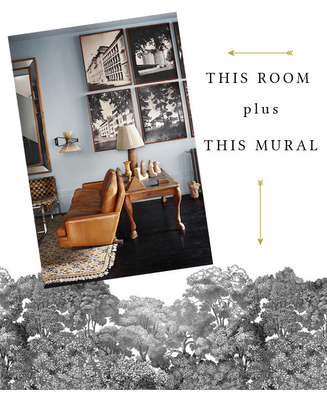 The framed pictures were really the inspiration in choosing this mural with the tree silhouettes a reoccurring theme on that gallery wall. If you have a collection in your room, then choosing a wallpaper (or a mural in this case) that unifies that theme and really brings it to the forefront of your design is one way to make that decision a little easier. Because the colour palette in the room is predominantlyΒ muted with lots of natural textures and colours, then going for a more muted colour palette in your wall covering means nothing will jar unnecessarily.