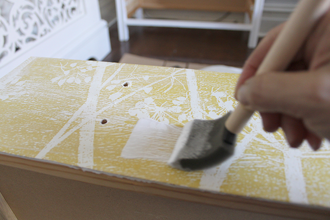 Using a sponge brush, I covered the drawer front completely with Modpodge, taking care to ensure the edges were all totally covered in the glue.