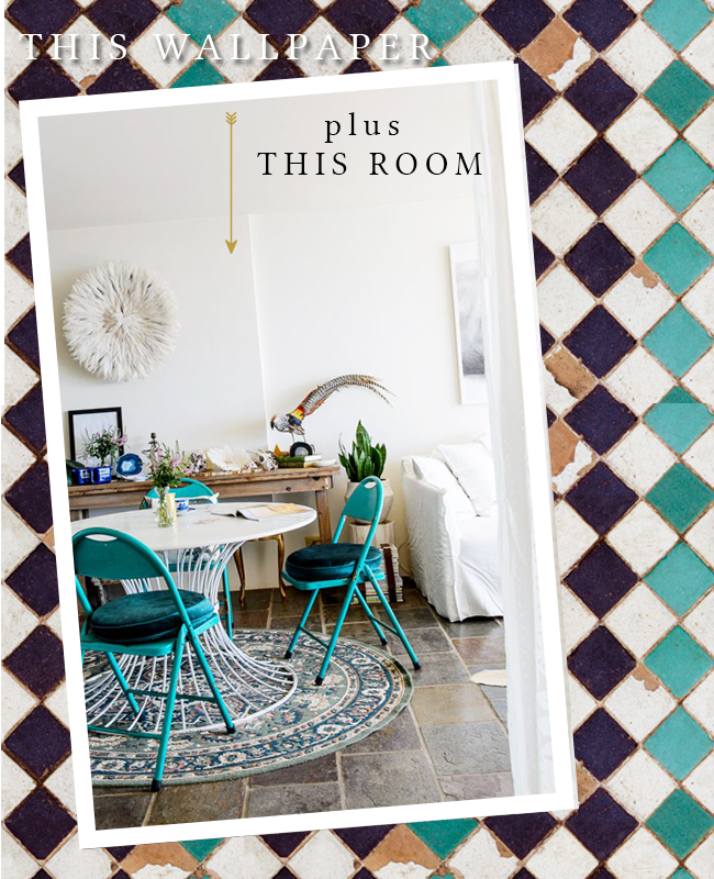 I love how it looks like encaustic tiles that have been weathered and worn – a perfect foil for those turquoise metal chairs and vintage rug and yet there’s no faffing with grout or installation or hell, even weathering – and yet, the tiles look as though they are already perfect aged (wabi sabi at it’s best). You can get the lived in lookย in so many forms with wallpaper – from tiles to bricks to wood – without ever having to wait for something to age perfectly.