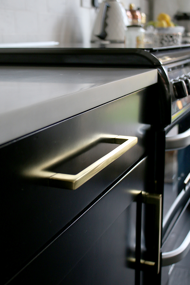 The cupboards look amazing in black! Especially with those fabulous handles! Also love that shiny black cooker – it all looks amazing! So excited to see the finished kitchen… especially about seeing the new wallpaper in the back of the top cupboards!
