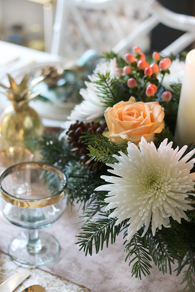 I know I said that my DIY Gold and Marble Coasters would be my last DIY of the year but I completely forgot that I still had this one to share! So it’s a little bonus one to finish off the year. If you saw my Christmas table setting, you will have seen this gorgeous floral and pine Christmas centrepiece on my table. Now, if there is one thing that I could never claim, it’s being good with floral arrangments. It’s something I’ve struggled with for a long time but if even a novice like myself can manage this one, I’m sure you can too.