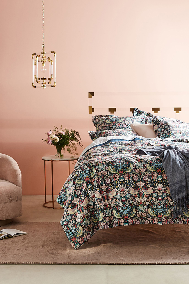 I’ll start with the fact that Liberty has joined forces with Anthropologie to create a whole line. I mean, as IF there was ever a more perfect pairing!! The Velvet Strawberry Thief bedding is just stunning although I’m rather swayed by the styling with that lucite bed and light fixture (neither of which are available in the UK sadly).