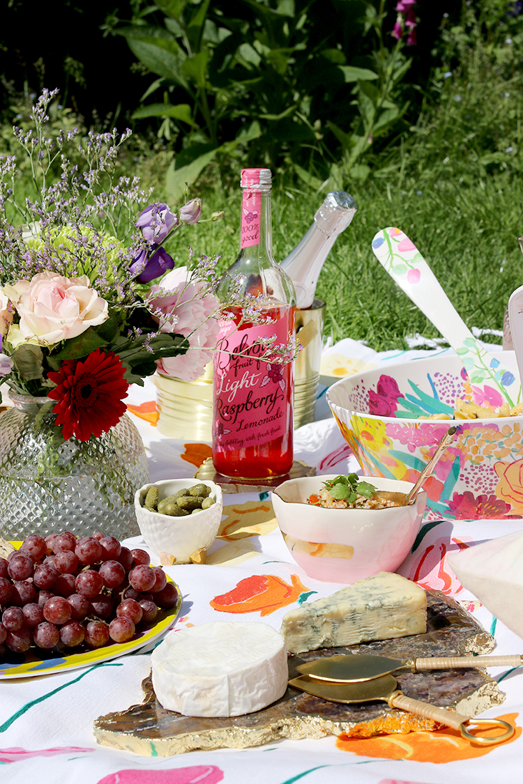 • To drink, I chose a couple of selections from Belvoir’s range – their Raspberry & Lemon and Lemonade – which not only look beautiful but also taste lovely as well and are a fantastic grown-up alternative for those who aren’t drinking alcohol. For those that are, a sparkling rose is light enough to enjoy in the sunshine! A filled ice bucket will keep everything cold.