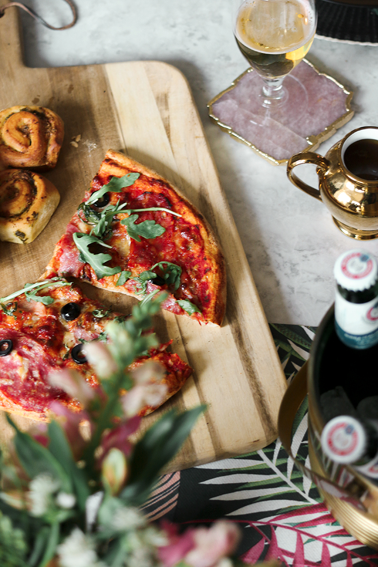 I also filled a cute marble bowl with some ‘fancy’ crisps – Kettle are one of my favourites – and filled a nice ice bucket (this one is similar) with a few beers and some ice to keep it all cold! My pizza was just served on a large wooden chopping board so it just went from the oven onto that and then straight on the table! Some pesto & mozzarella swirls were also picked up with the Salami, ProsciuttoΒ & Chorizo Pizza in the fridge section of the supermarket.