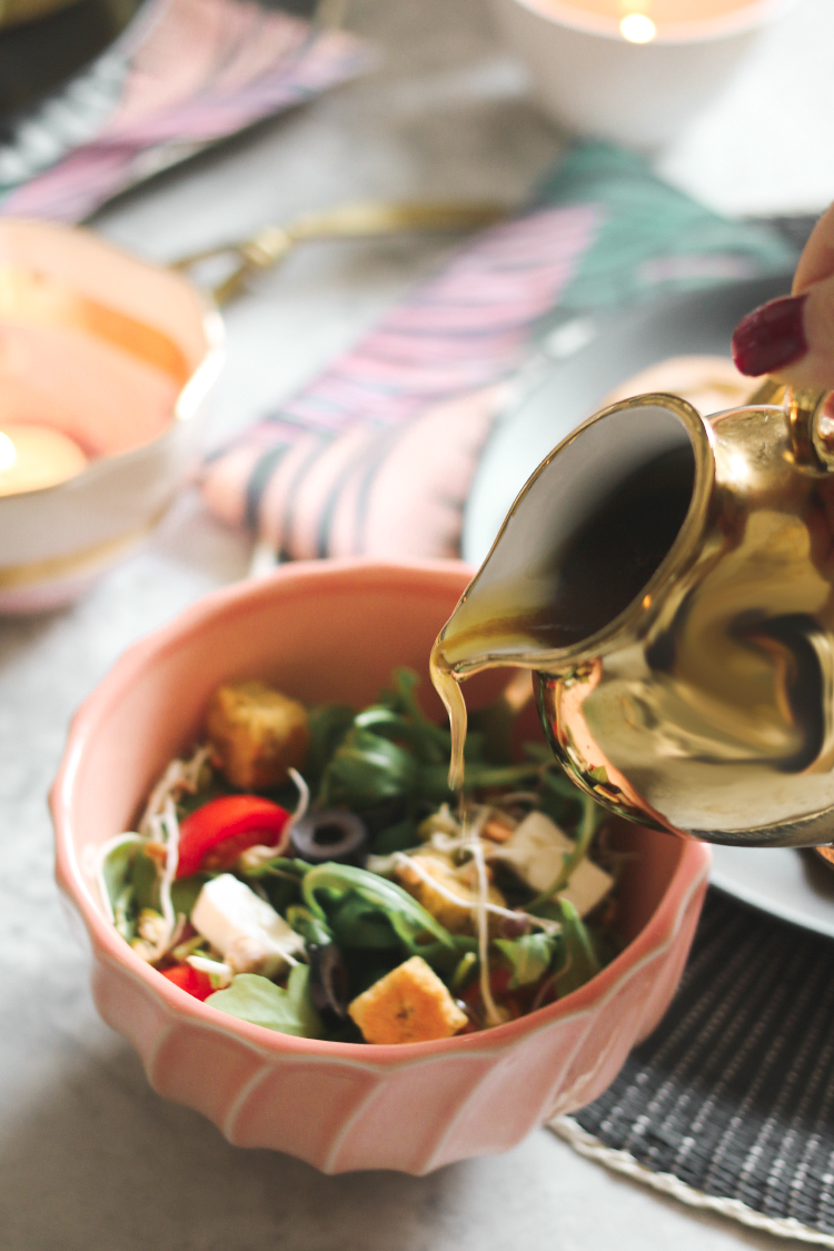 I decided the least I could do was throw together a salad which required only a tiny bit of effort – I love the peppery taste of rocket (aka Arugula) with a pizza and it does seem to balance out the heaviness of doughyΒ greasy pizza. So in a couple of pretty peach bowls (from Anthropologie), I threw in rocket, sliced black olives, sliced cherry tomatoes, feta cheese, a mix of sproutsΒ and croutonsΒ and just topped it with some simple balsamic and olive oil. It took like 2 minutes. Easy.