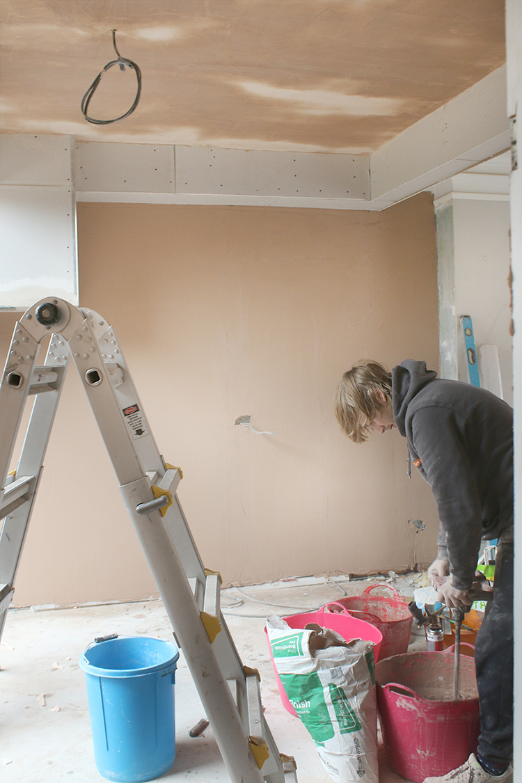And we’re now up to the point where the whole space is being plastered. It’s amazing how transformative this step is, creating a clean and lovely slate. The plasterer works FAST as well – I blink and another wall is totally done which is super exciting.