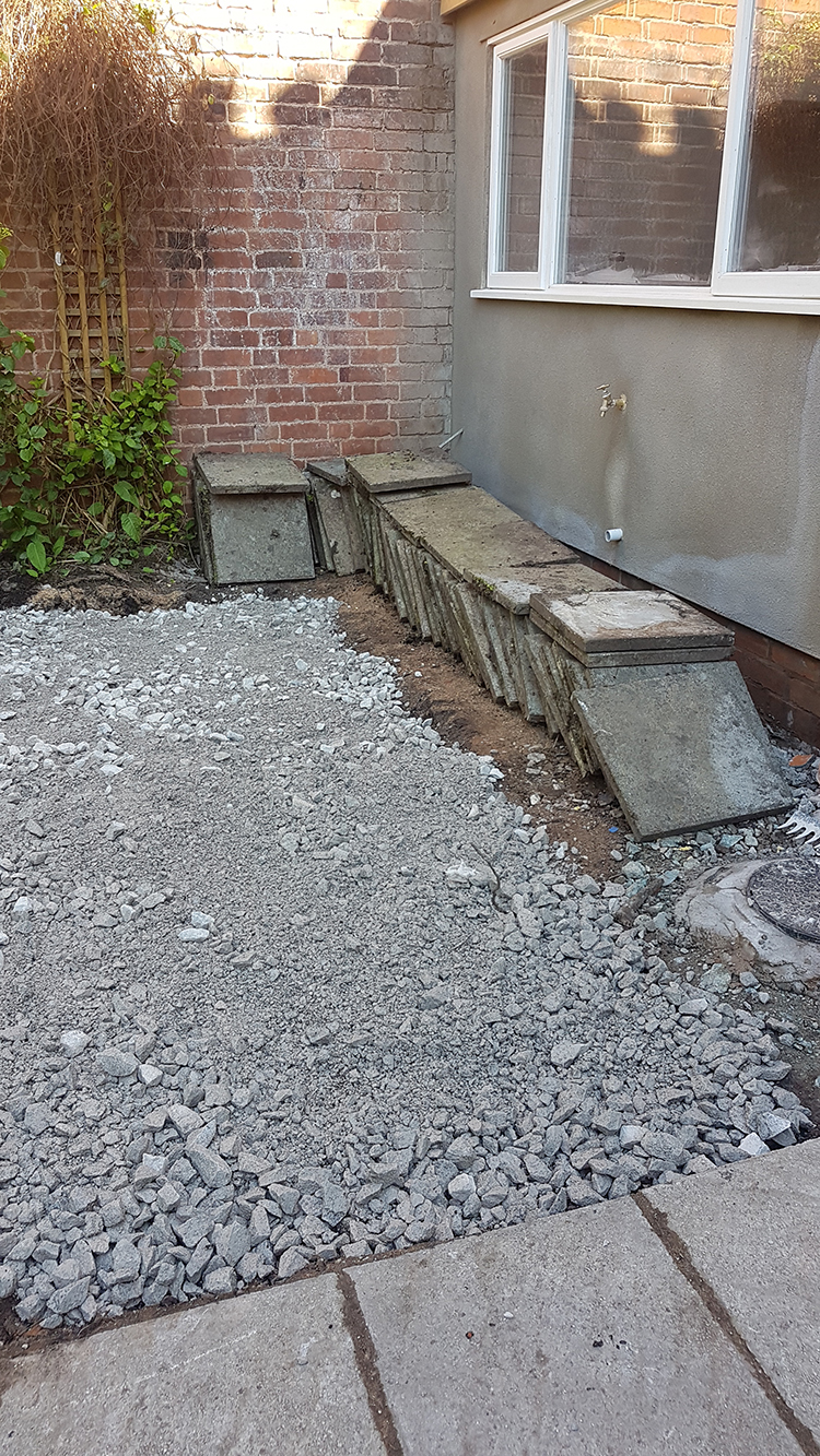 So with these plans in mind, we began work a couple of weekends ago, digging a few inches out where the new/old paving slabs would be laid, creating a huge pile of removed earth in the process which will later be used in some raised planters.