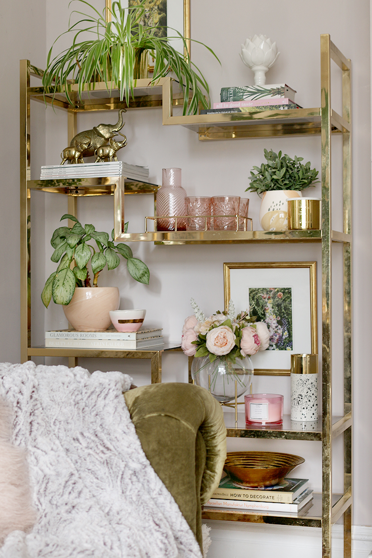 Introducing the Finishing Touch Styling Service - gold vintage shelf styled with pink and gold accents and plants