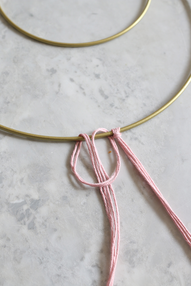 Step 3: Hopefully the image above explains the knot itself but you’ll want to take two long strands, folded in half and where it’s folded, you want to loop that under your largest ring and pull the ends through the loop to form a knot. Make sure the loop is behind the ring so you can see the knot from the front.