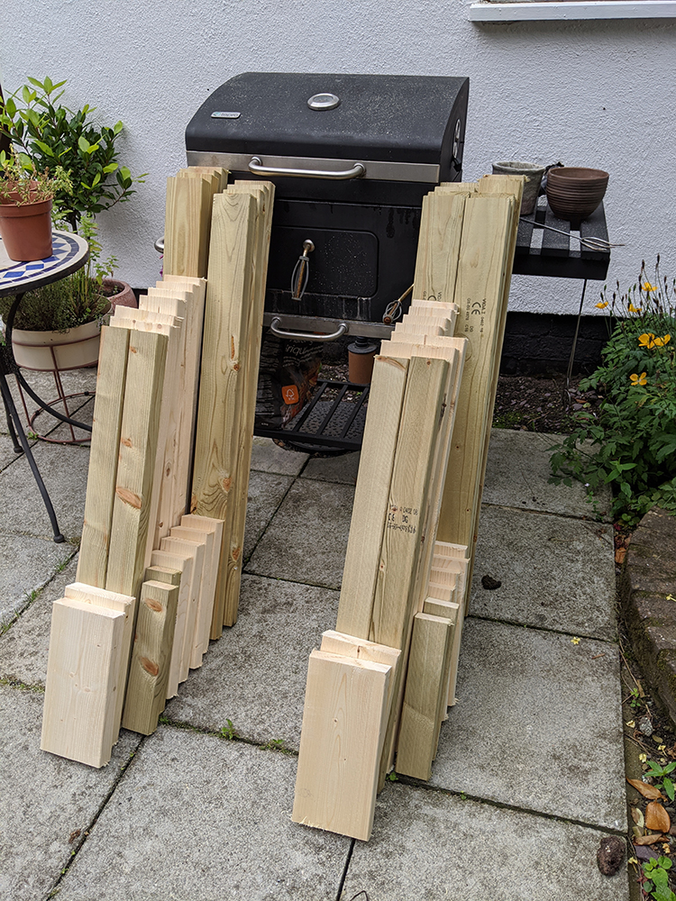 For the slats using 15mm x 36mm x 2.4M lengths of wood: