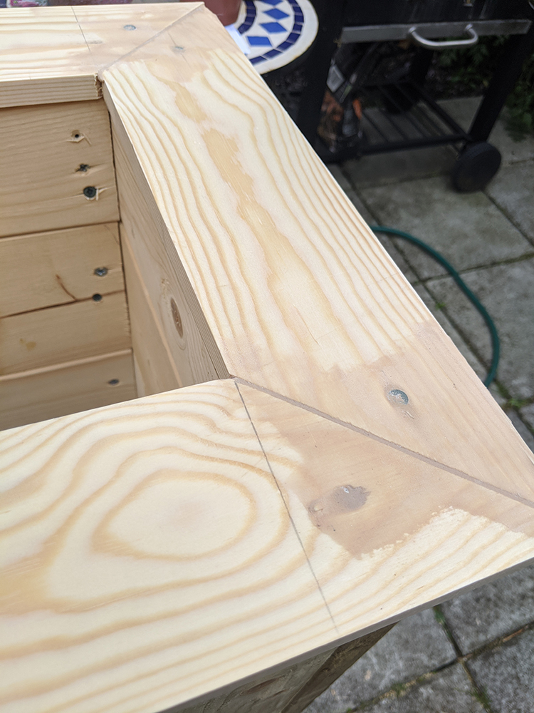 Cut each of the shorter pieces at a 45Β° angle going inwards so that the longest side is 41.3cm to create your mitred top (yes we broke the very edge there! We used wood filler and glue to patch it up!).