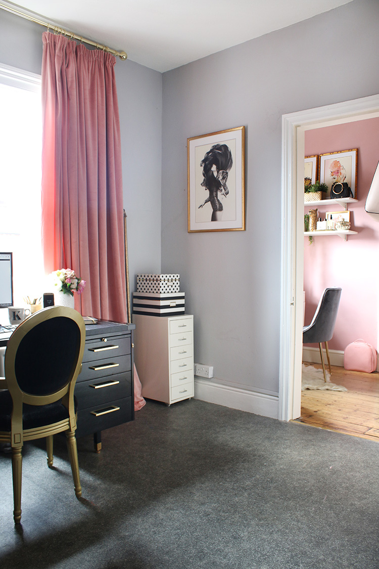 One other thing I realised quite early on is that I placed my desk right in front of that big double window. It seemed like a good idea at the time, having south-facing views over the street but there was a really big issue with this set-up. There’s so much glare on my screen that half the time, I have to close the curtains in order to see my screen! So I’m not only sat in a rather uninspiring space, I’m also sat in the dark! Not the most conducive to getting things done when most of my work is done online. There wasn’t really any other way to configure the room with the furniture I had and so I had to just live with it for a while but I knew it had to change.